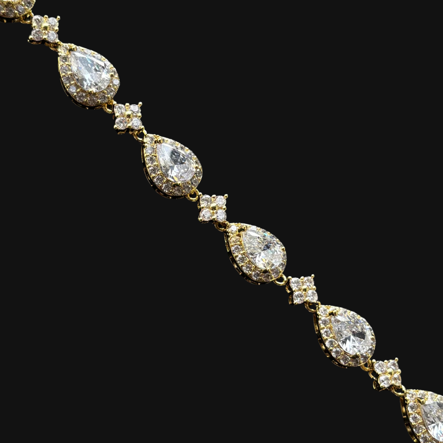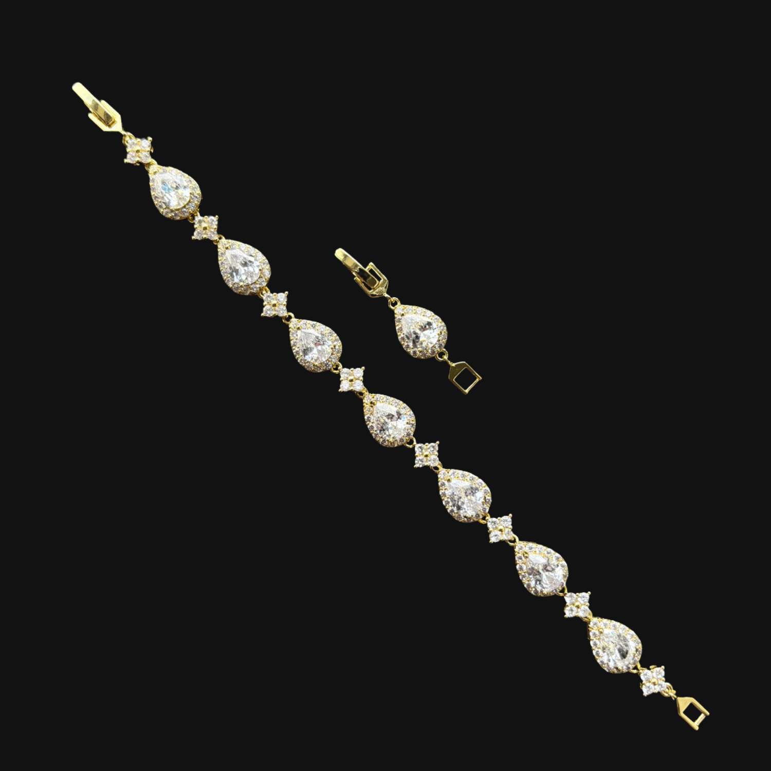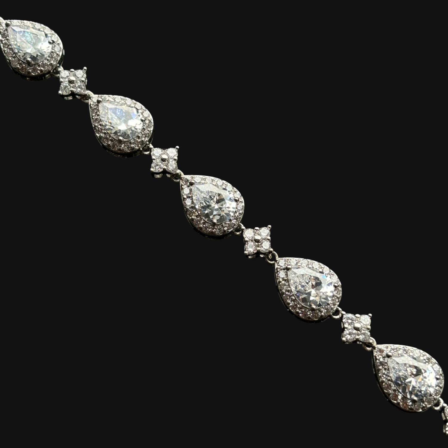 The Starlink Droplet Bracelet blends precision and elegance with a bold touch. Alternating star-shaped connectors and teardrop stones create a distinctive pattern that catches the light from every angle. Each bracelet is uniquely designed and not commonly found, making it a statement piece for those who appreciate refined detail and individuality. Subtle, modern, and effortlessly luxurious.