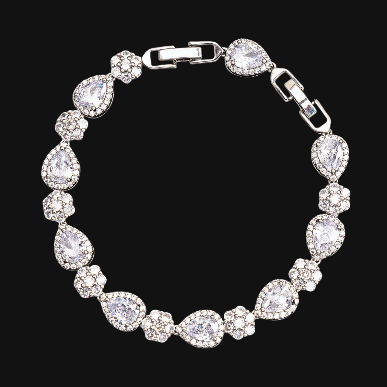 The Flora Droplet Bracelet captures the beauty of nature in its most elegant form. Featuring delicate petal-like clusters and teardrop-shaped stones, it reflects light with every movement, creating a soft yet striking sparkle. Each bracelet is a truly unique piece — carefully designed and rarely found, making it the perfect statement for those who value individuality and refined elegance. Graceful, radiant, and unlike anything else.